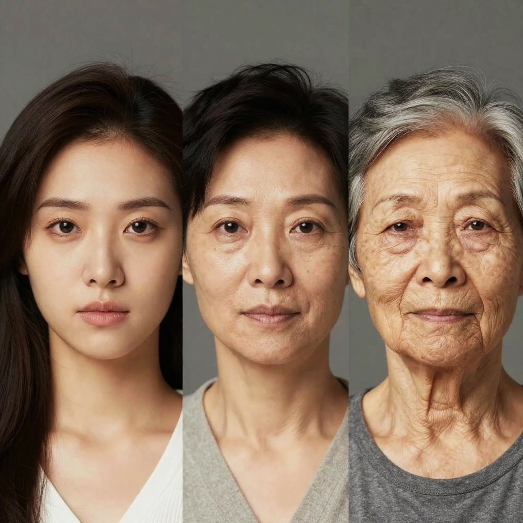 AI age filter effect on a female face showing three distinct age phases - young adult, middle-aged, and elderly - seamless blending, photorealistic rendering, natural lighting, subtle emotion shifts, digital art with a sleek modern background