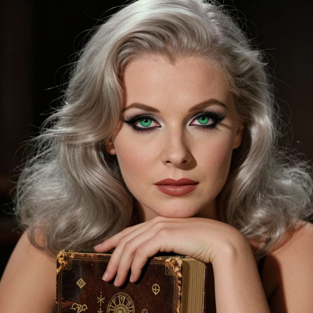 Photograph of a woman with striking silver, wavy hair and vivid green eyes, looking directly at the camera with a neutral expression. She has fair skin, full lips with nude lipstick, and dark, dramatic eye makeup. She is holding an old, brown leather-bound book with gold decorative elements in front of her chest. The background is dark, making her light hair and book stand out prominently. The lighting highlights her facial features and hair texture, giving a slightly vintage, glamorous feel.
