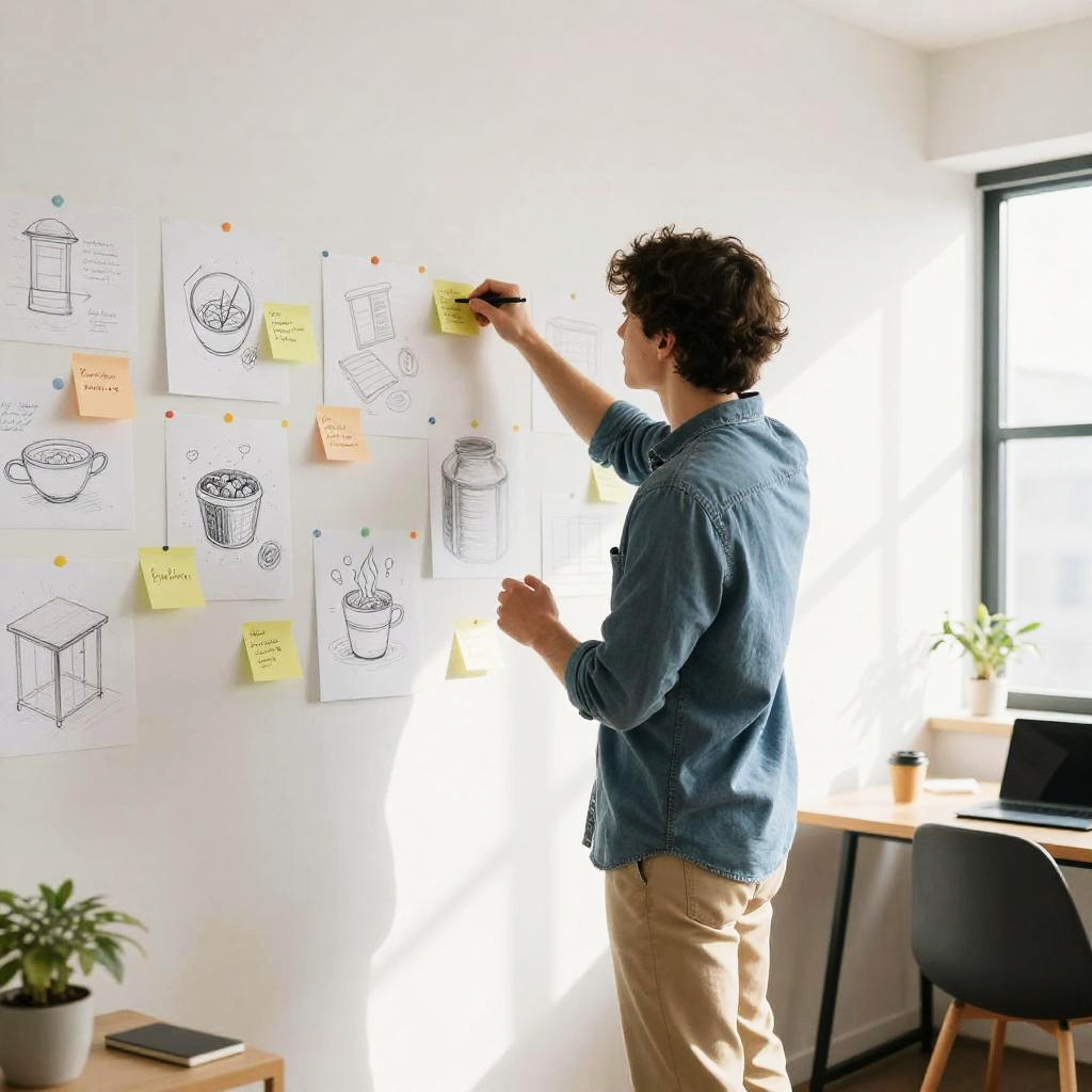 Sketch content creator brainstorming with sticky notes and rough sketches pinned on a wall, casual outfit, bright daylight pouring in, lively and inspiring workspace filled with creativity