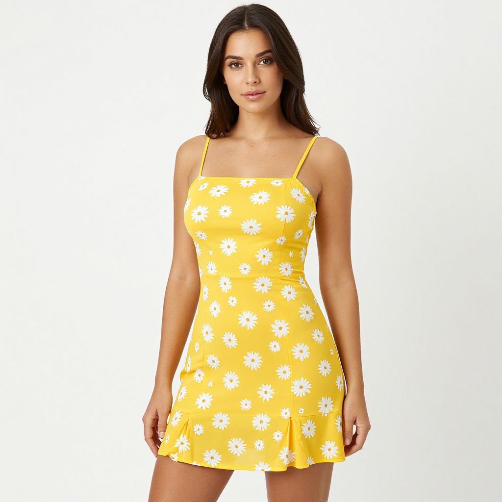 "Woman, casual summer style, mini sun dress in yellow with white daisy print, straight neckline, thin spaghetti straps, form-fitting silhouette, slightly flared hemline, plain white background.. Sexy. Pretty face and beаutiful eyes. Big breasts."
