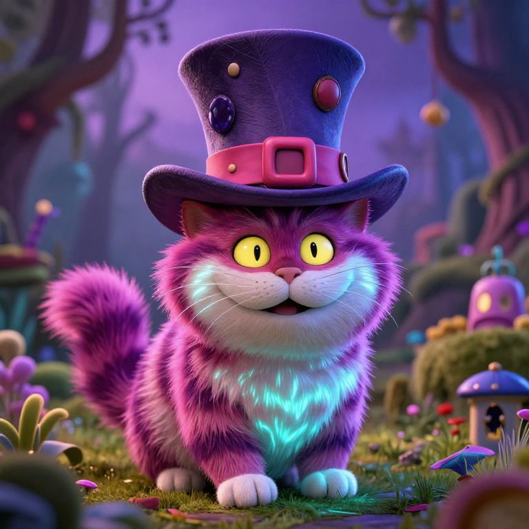 A whimsical 3D-rendered illustration depicts a regal orange tabby cat adorned in a black tuxedo, bow tie, and top hat, conducting an enchanting symphony with a laser pointer as its baton, captivating an audience of animated insects in a vibrant, high-definition scene filled with dynamic lighting effects and a magical atmosphere.