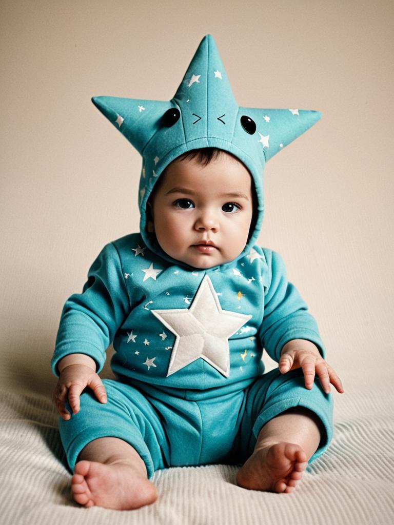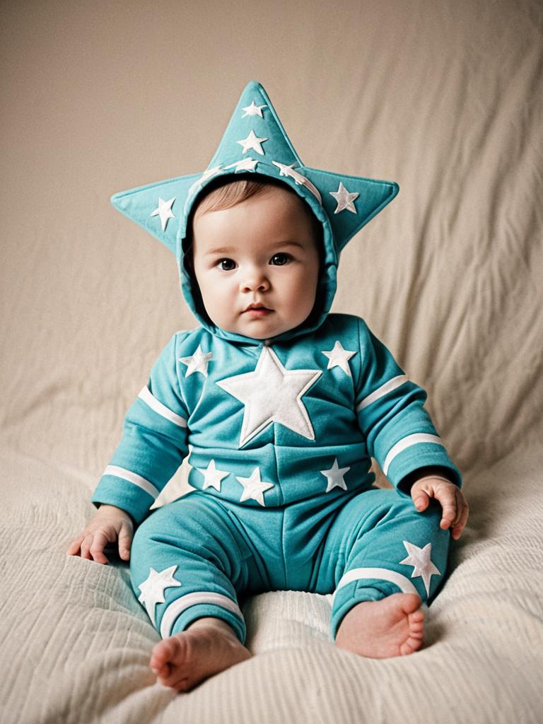 Photorealistic portrait of a baby wearing a teal blue star-themed costume with white star patterns and a three-point star hood. The infant is sitting on a neutral-colored fabric surface, wearing white socks, with a neutral background.