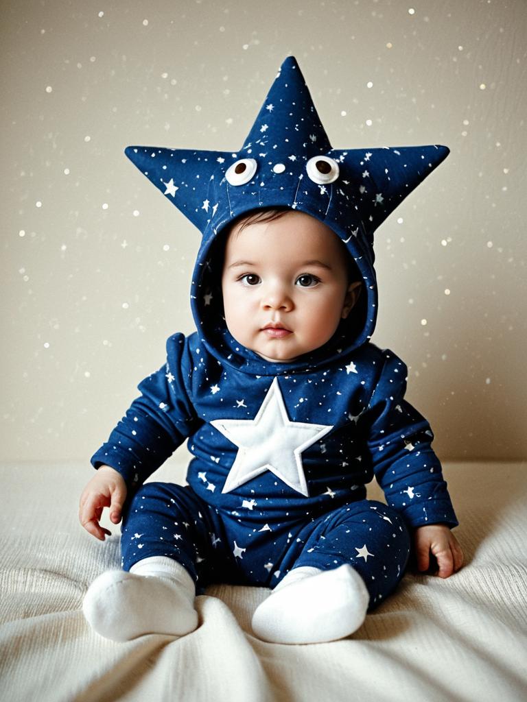 Infant in Baby Star Costume, photorealistic baby cosplay portrait, cinematic realism