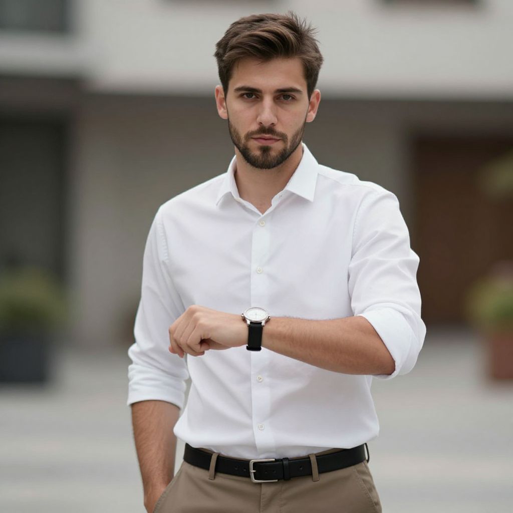 "man dress shirt size, 1boy, male focus, necktie, shirt, blurry background, solo, collared shirt, white shirt, realistic, blurry, black necktie, looking at viewer, upper body, facial hair, outdoors Realistic photo of casual sexy person with pretty face"