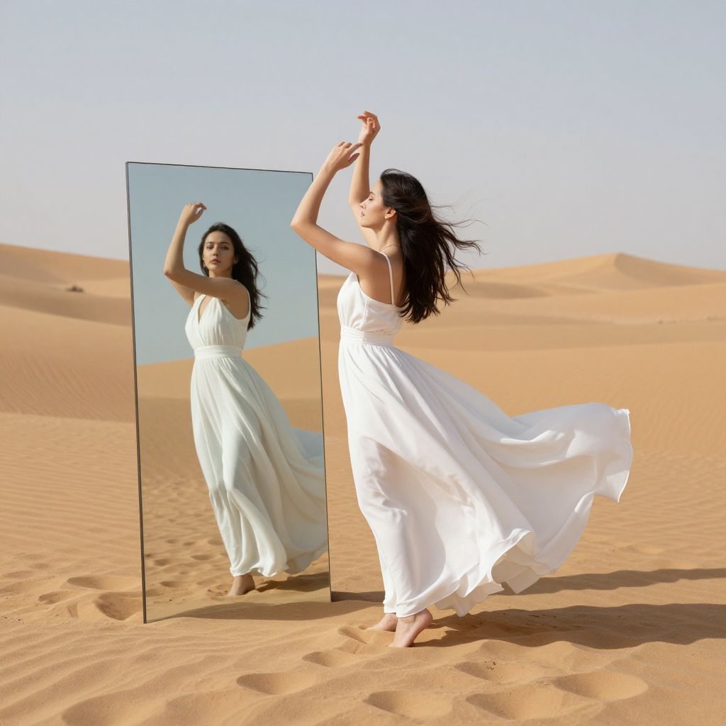Photograph of a woman in a flowing white dress, standing barefoot in a desert, posing with arms raised, reflecting in a tall mirror against a