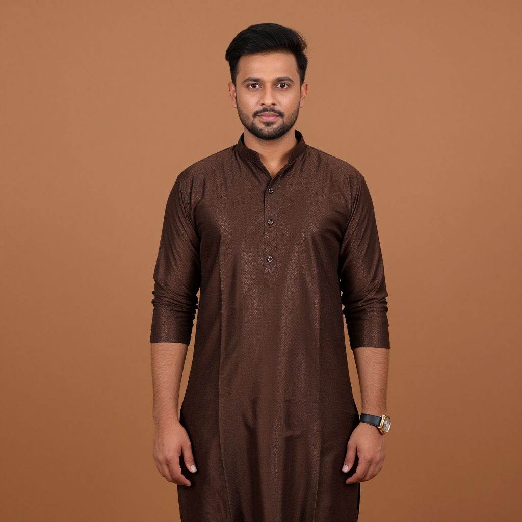 Photograph of a South Asian man standing against a solid, warm brown background. He has short, dark hair and a neatly trimmed beard. He wears a dark brown, long-sleeved traditional kurta with a buttoned-up collar. The fabric has a subtle, textured pattern. He has a medium build and is wearing a black wristwatch on his left wrist. His expression is neutral, and he looks directly at the camera. The lighting is even, highlighting his facial features and the texture of his kurta. The overall style is simple and formal.