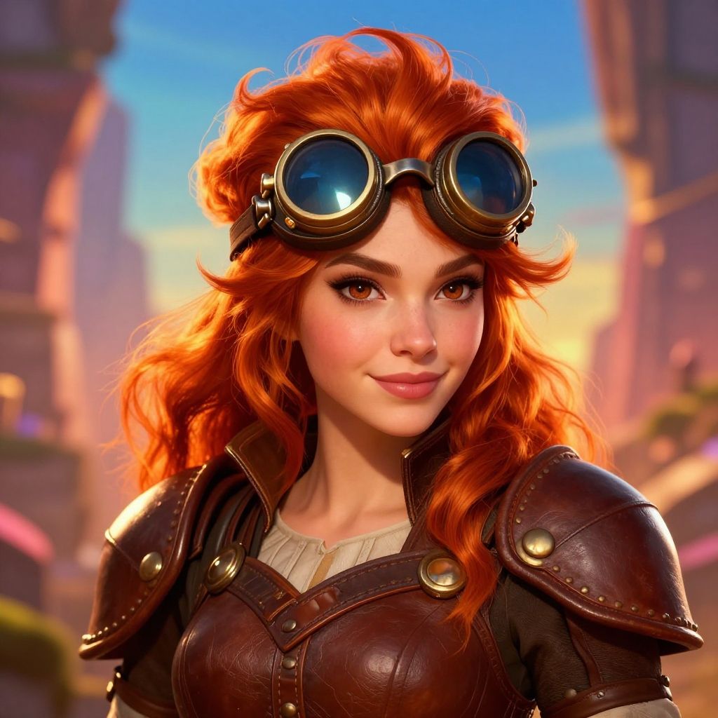 Amber official art, detailed character portrait of a confident young adventurer with fiery auburn hair, wearing steampunk goggles and leather armor, vibrant fantasy background