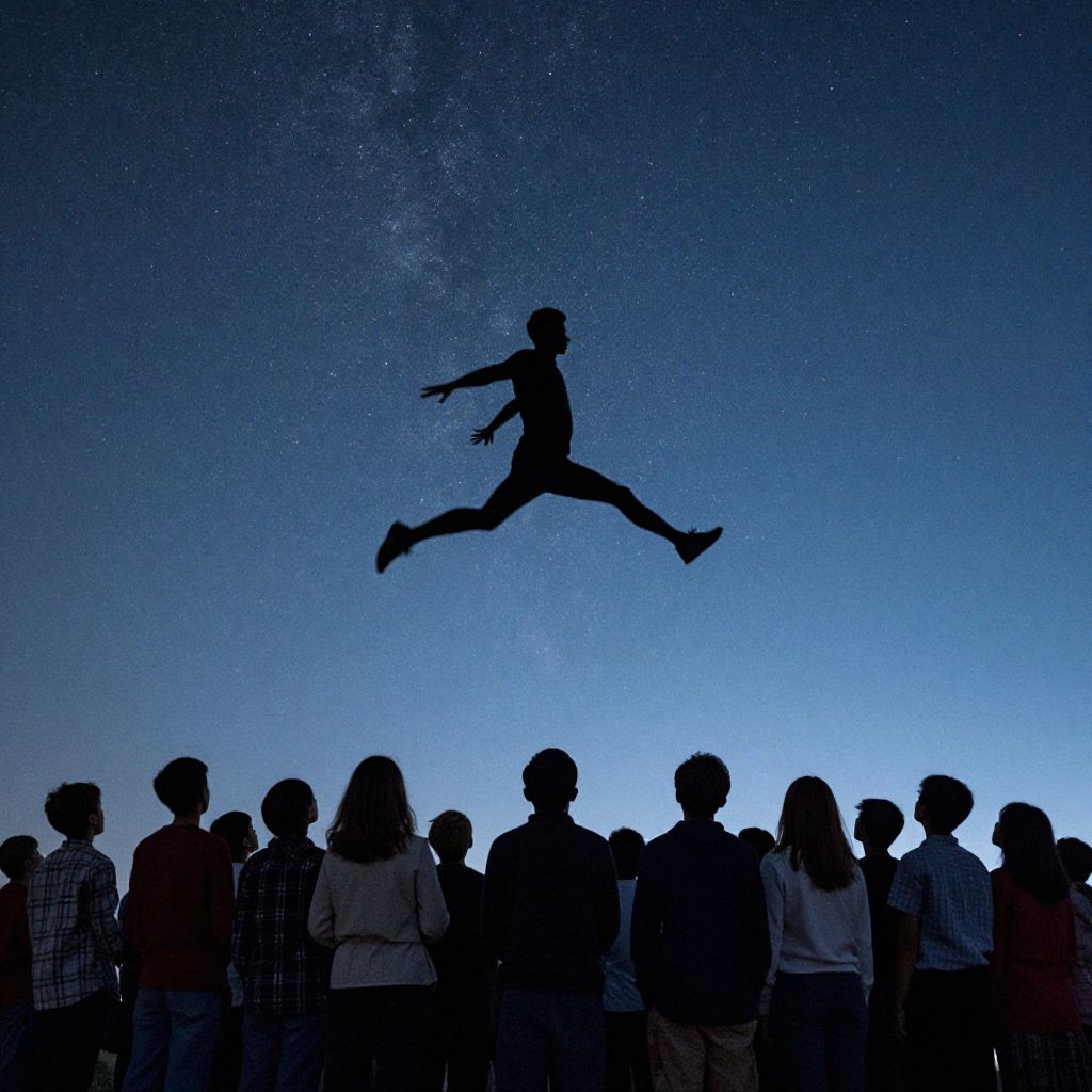 Against the cosmic backdrop of a starlit sky, a solitary silhouette leaps into the void, embodying the transcendence of human spirit and the eternal quest for freedom, while below, a crowd of grounded figures watches in awe, their collective breath held in the quiet tension of possibility.