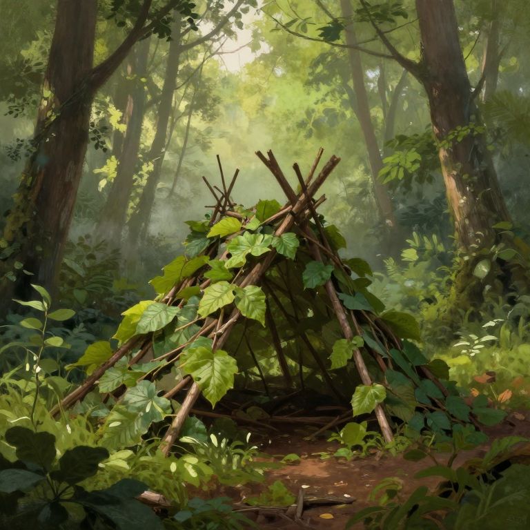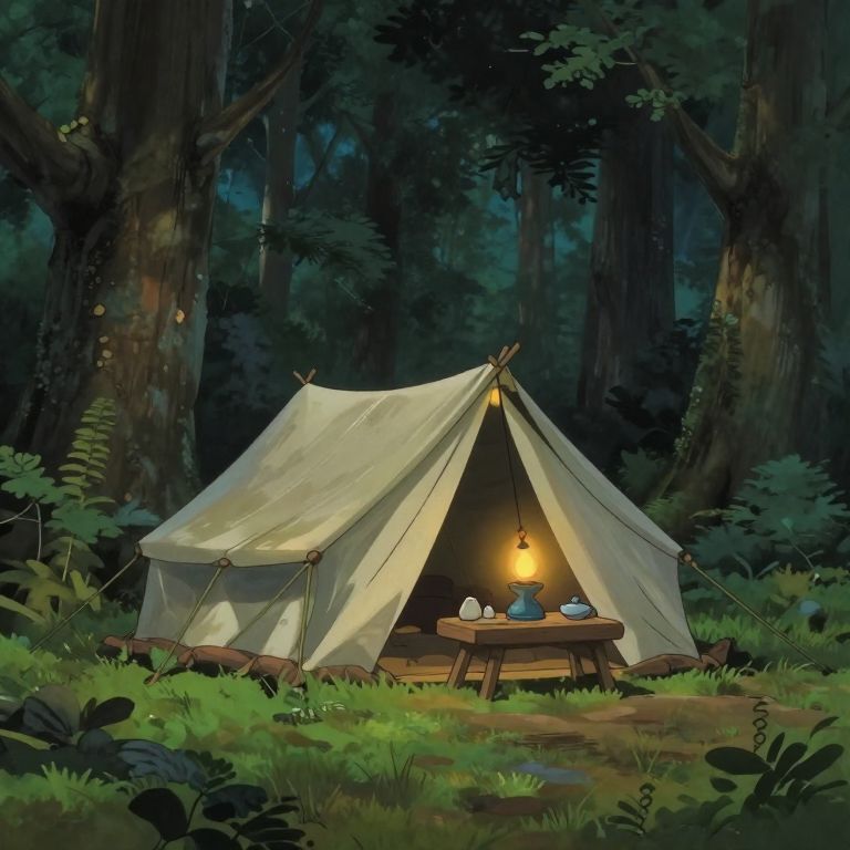 Close-Up Filter ghibli style, flat illustration, small tent in large woods, dark, ambient, alchemy table, peaceful, UHD,