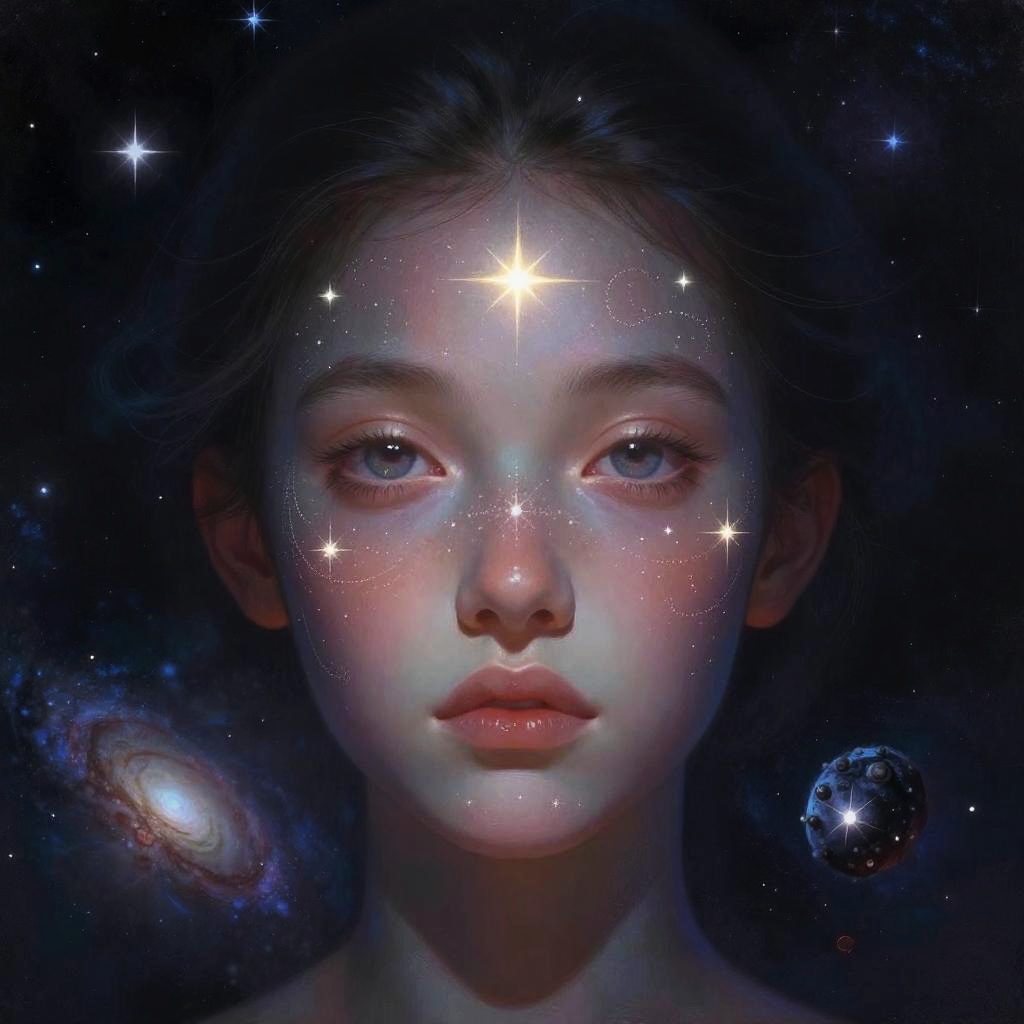Close-up of a Lyrian starseed's face illuminated by starlight, delicate celestial tattoos glowing softly, cosmic background filled with swirling galaxies and asteroid belts, digital painting with a dreamy and otherworldly mood.