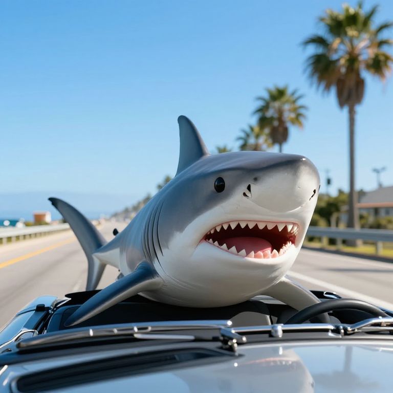 Shark dressed like a racing driver, behind the wheel of a futuristic racing car on a desert track, dust flying, intense focus, highly detailed vehicle design