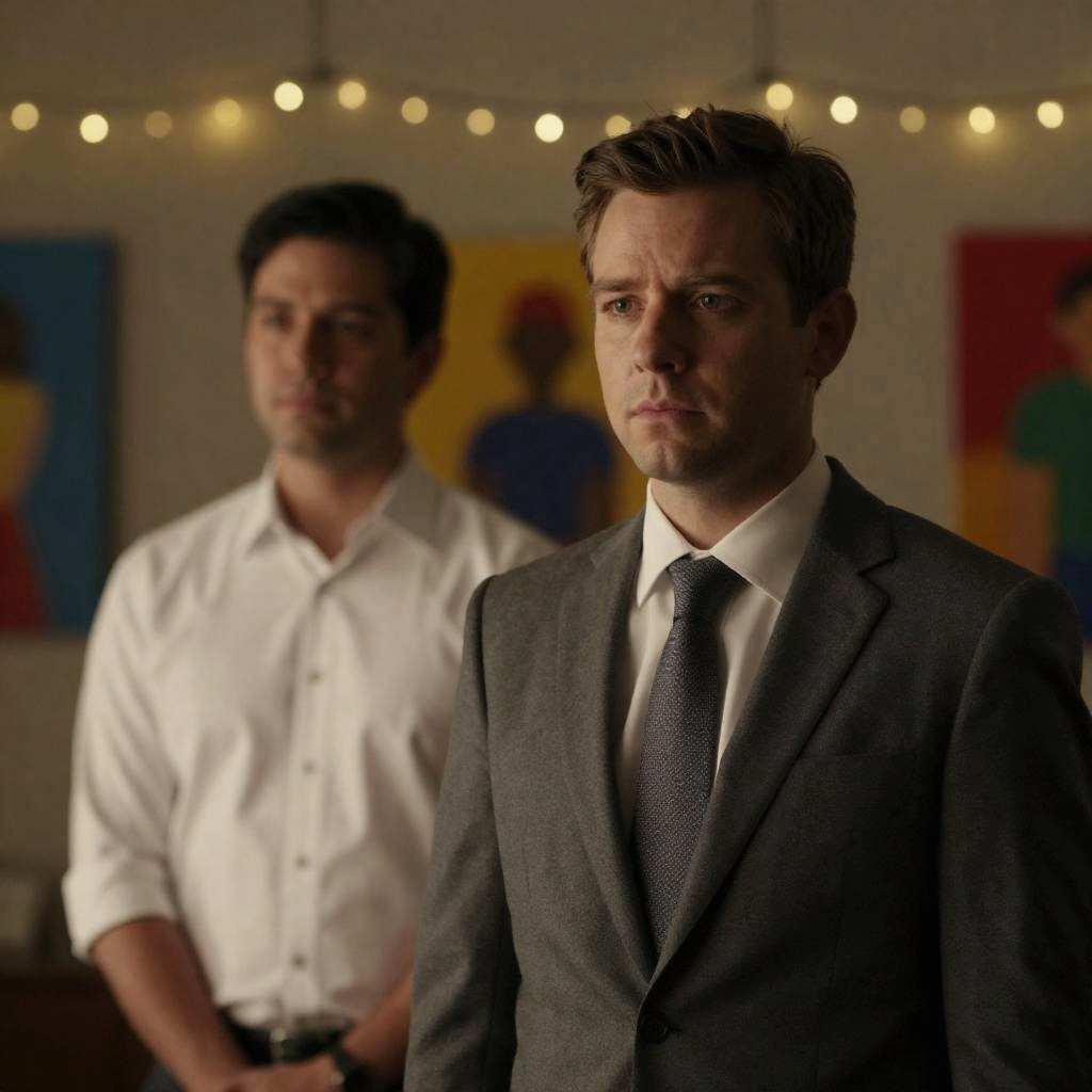 Two men standing indoors. Left man, muscular, short brown hair, black headband, red tank top, hairy chest, serious expression. Right man, shorter brown hair, pink zip-up hoodie, blue shirt, neutral expression. Background: white brick wall, abstract drawing, yellow door.