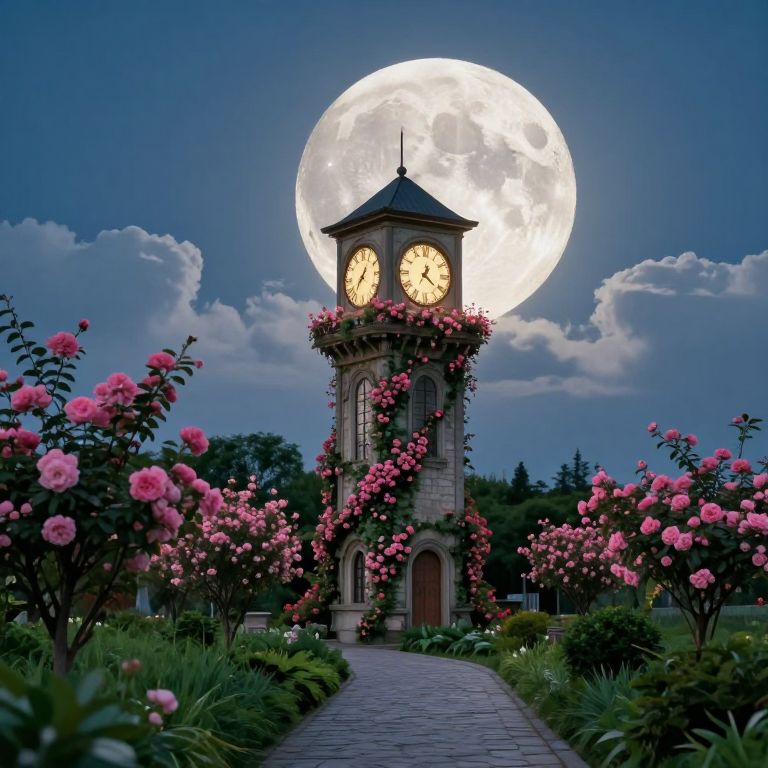 A vivid digital artwork depicts a clock tower adorned with pink roses, standing on a cobblestone path. The tower, with its illuminated golden clock faces, is centered under a massive, bright full moon in a deep blue night sky with fluffy clouds. Surrounding the path are lush green shrubs and blooming pink roses, creating a romantic and enchanting garden scene. The moon's glow illuminates the tower and path, enhancing the dreamlike atmosphere.