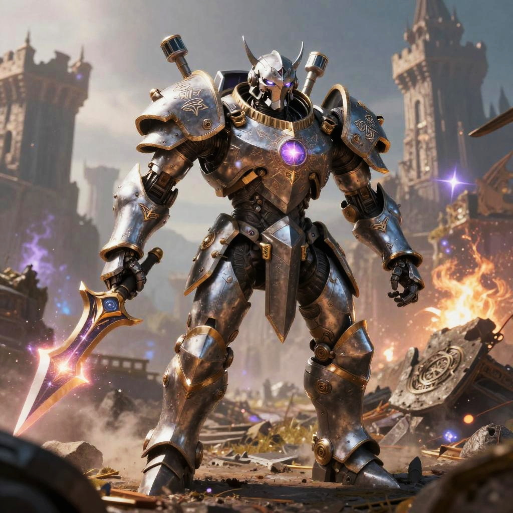 5e autognome, a battle-ready automaton with layered metal armor adorned with arcane glyphs, wielding enchanted weaponry and emitting soft magical light, amid a war-torn fantastical battlefield filled with magic bursts and ruined castles, dynamic and detailed.