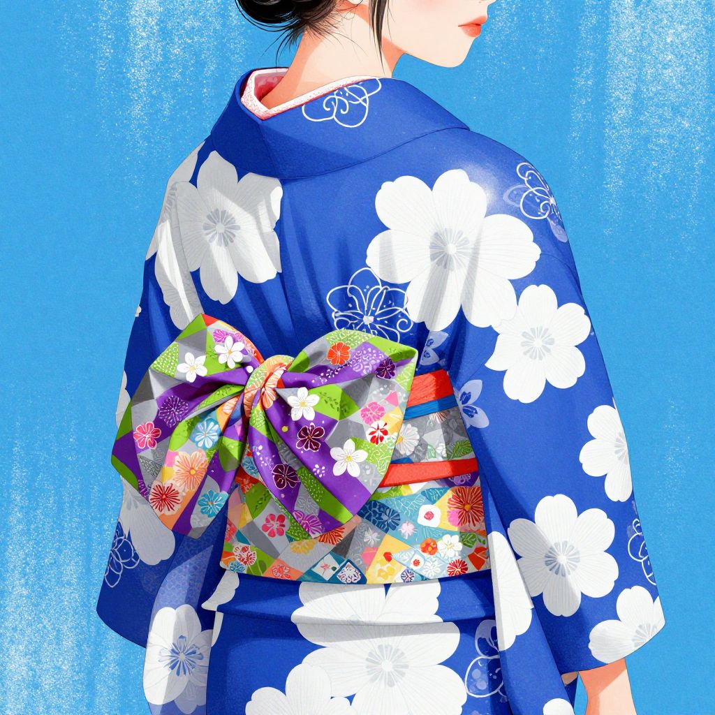 A vibrant digital illustration depicts the head and torso of a woman adorned in a traditional Japanese kimono featuring a blue and white floral pattern, complemented by a colorful obi with purple, green, white, gray, and pink floral designs, set against a shiny blue background, showcasing a blend of cultural elegance and modern artistic flair.