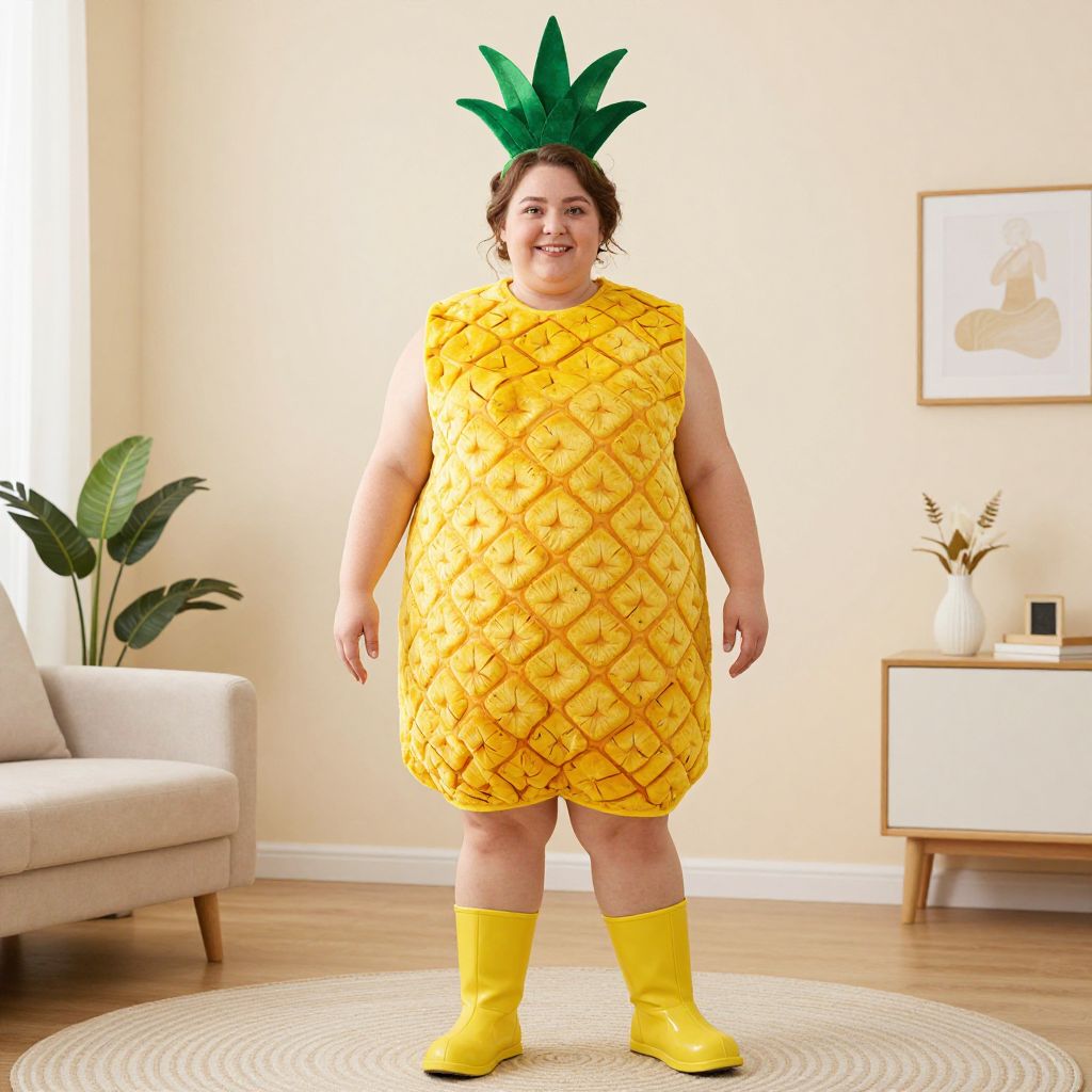 Plus Size Pineapple Costume, dressed in a pineapple costume standing in a room