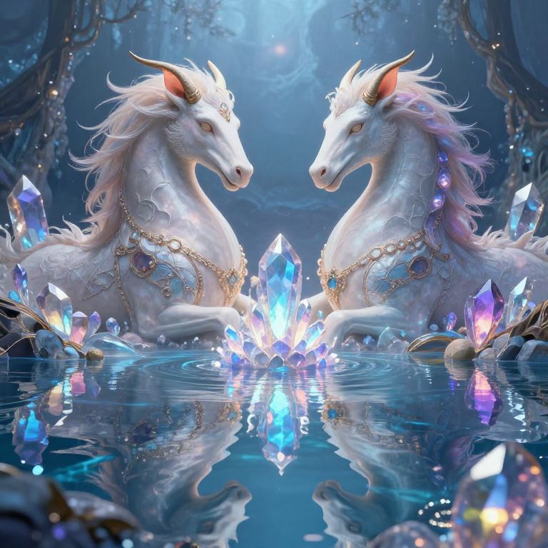 Digital art of two ethereal white unicorns with glowing crystal necklaces, surrounded by vibrant blue and purple crystals in a reflective, mystical water pool under