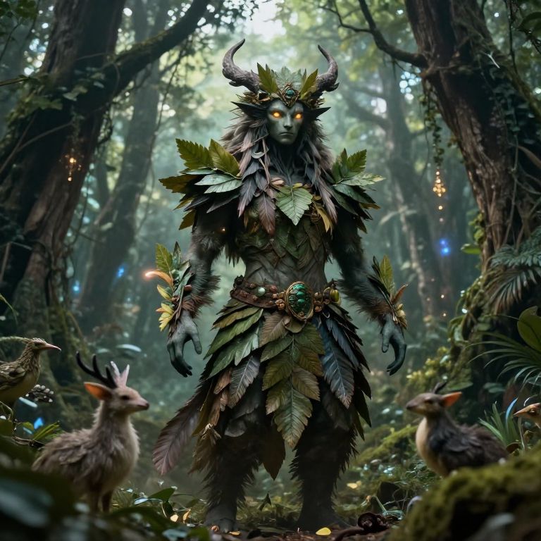 Caicedo depicted as a mythical guardian of the forest, adorned with natural elements like leaves and feathers, glowing eyes, surrounded by magical creatures and ancient trees, ethereal lighting, fantasy art style with intricate details.