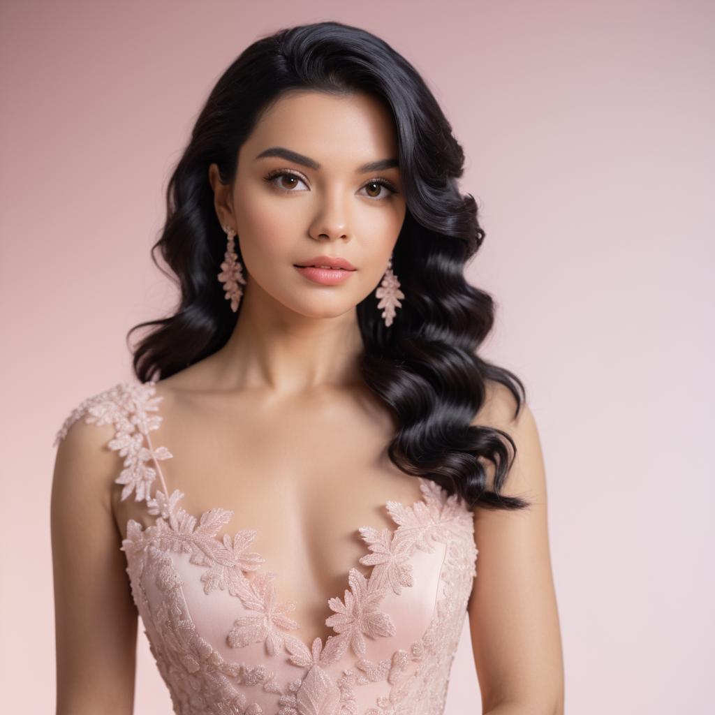 Portrait of a young woman with shoulder-length wavy black hair wearing a romantic blush pink evening gown with intricate lace detailing and thin straps. She has a subtle makeup look with nude tones and is accessorized with large, ornate earrings. The background is a soft gradient in matching blush tones, emphasizing the romantic and elegant style of the image.