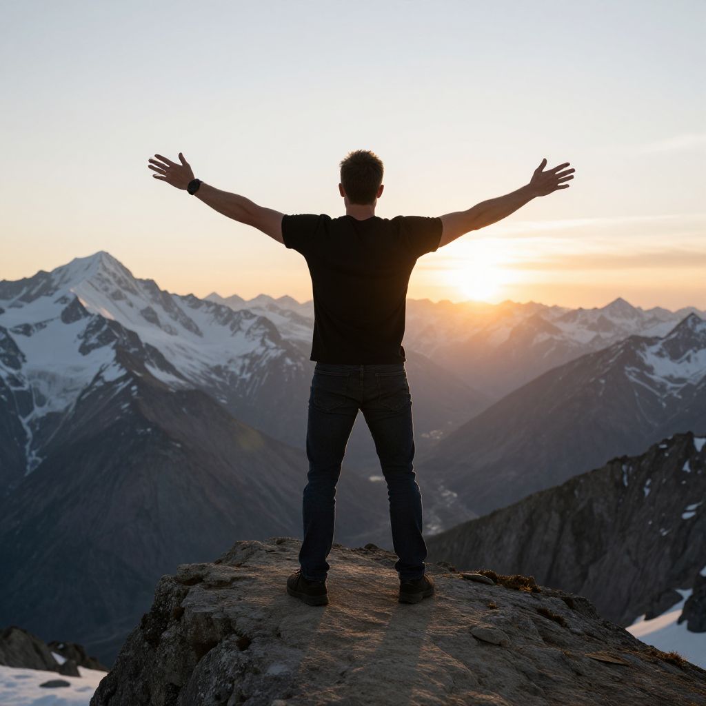 Prompt for man photo: A strong, athletic man in a black t-shirt and jeans stands on a mountain cliff at sunrise, arms outstretched, panoramic view of snowy peaks and a glowing sky, adventurous mood, high contrast, dramatic lighting, midjourney realism.
