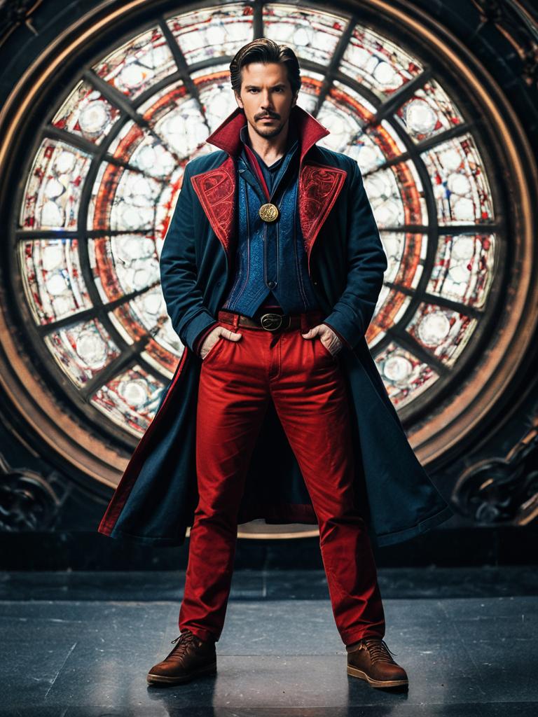 A man wearing a detailed costume inspired by Doctor Strange from the Multiverse, featuring a long dark coat with red lining, red pants, a blue shirt, and a mystical pendant. He has brown hair, a mustache, and a goatee. He stands confidently with hands in pockets in front of a large circular stained glass window with intricate red, white, and gray patterns. The setting has a dark, dramatic atmosphere.