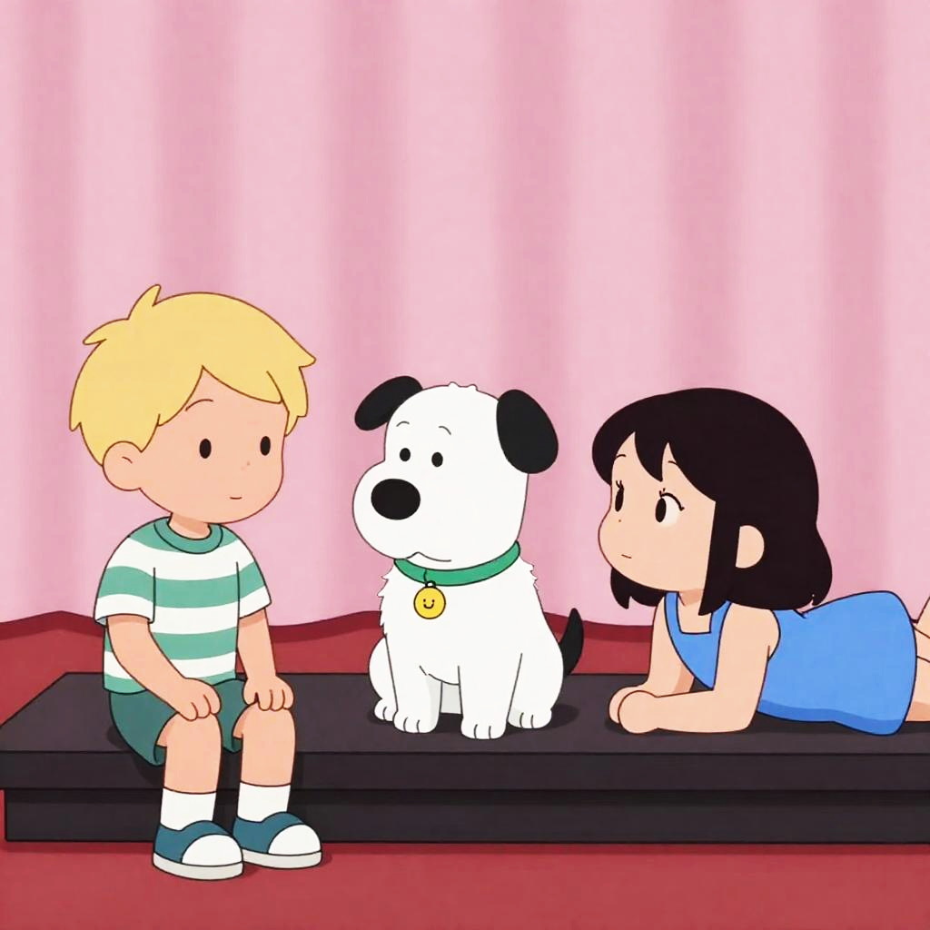 Cartoon drawing of four children and a white dog in a pink-decorated room. Girl in purple dress pulls dog's ear. Two other girls with hair bows smile. Table with cupcakes on right. Heart decorations hang above. Wooden floor.