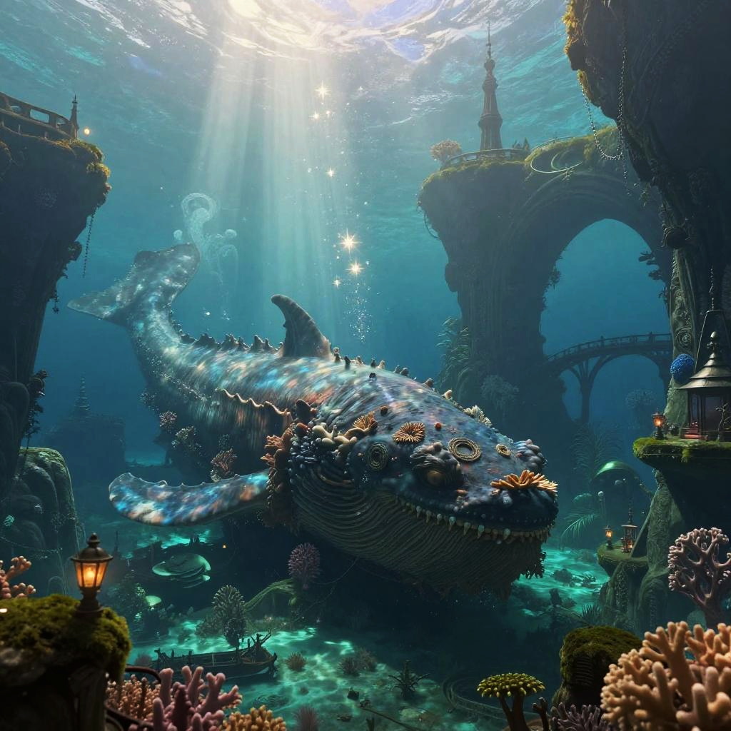 A huge coral leviathan entwined in sunken shipwreck set within underwater archipelago with shimmering rock formations, wrapped in ethereal mist and drifting incense, glowing stars scattered above, a celestial vault painted with turquoise gradients with shafts of filtered sunlight. Tranquil waters mirror the heavens, distant spires and bridges on rocky arches, lantern-lit sanctuaries and mossy terraces, a serene dreamlike atmosphere with surreal, intricate details; cinematic composition, volumetric fog and light rays, hyper-detailed textures, high dynamic range, wide-angle vista, depth of field, soft rim light, subtle film grain, epic scale.
