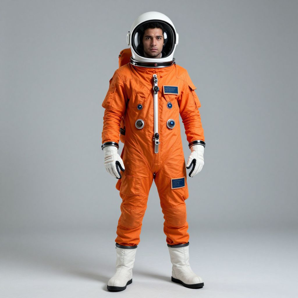 Nasa orange space suit, solo, 1boy, male focus, full body, standing, gloves, helmet, boots, black hair, astronaut, spacesuit, looking at viewer, white footwear, closed mouth