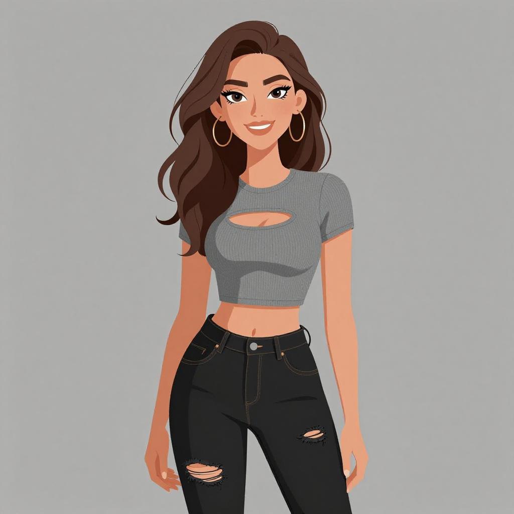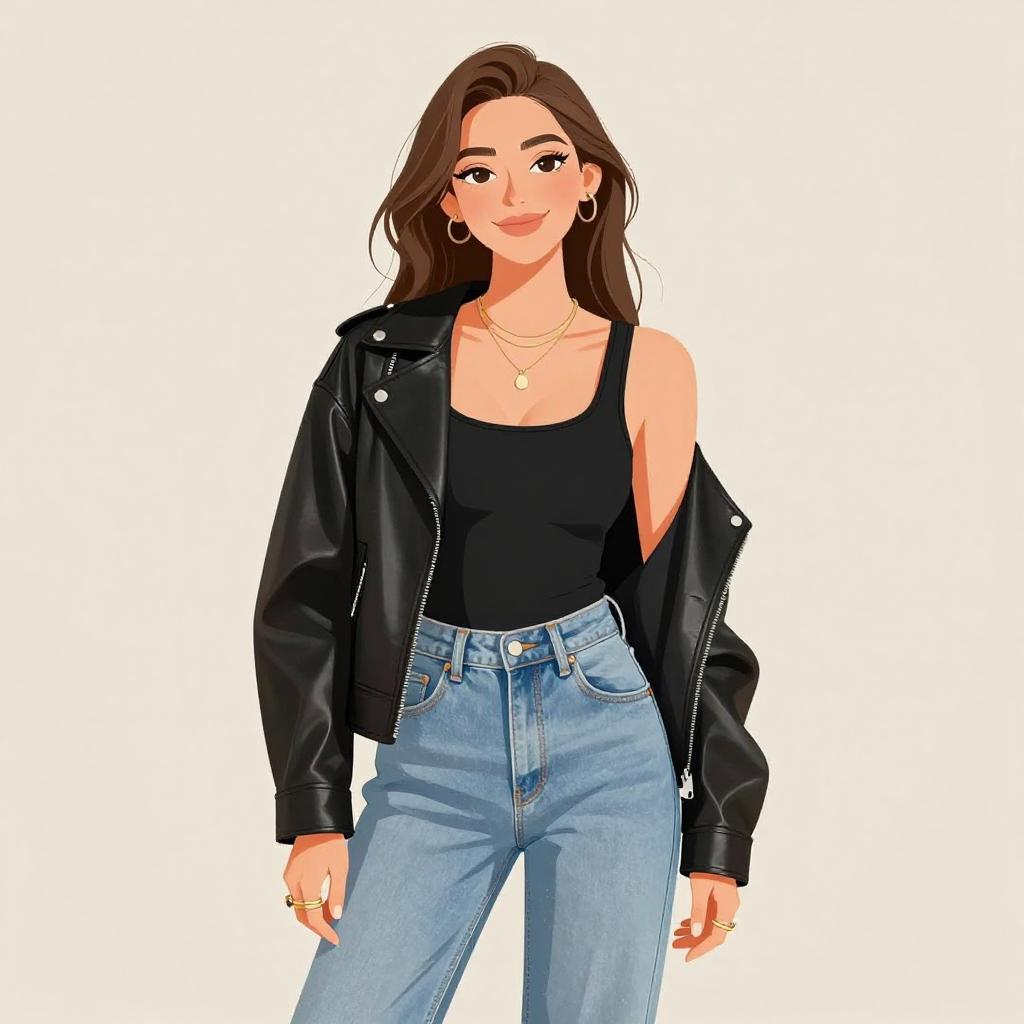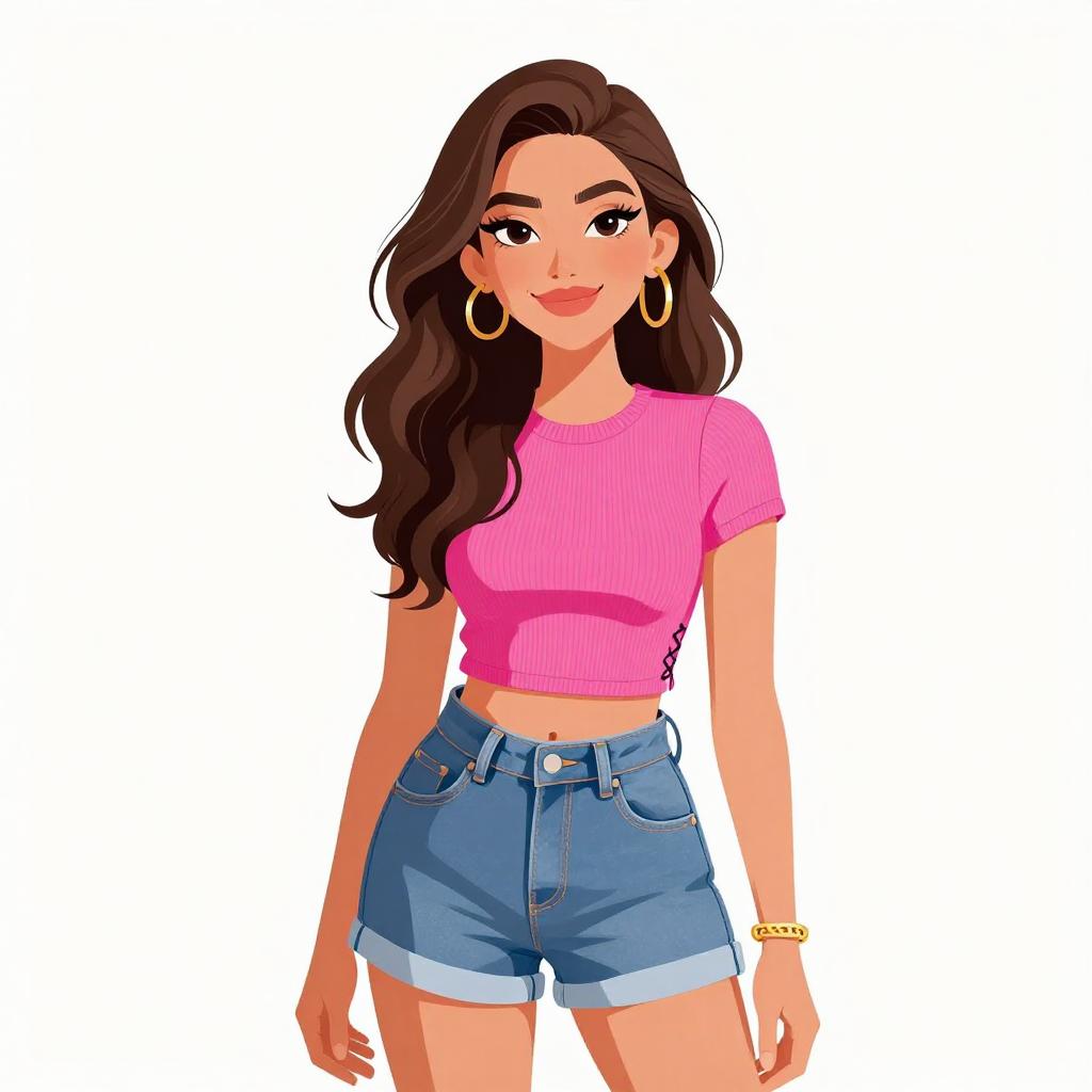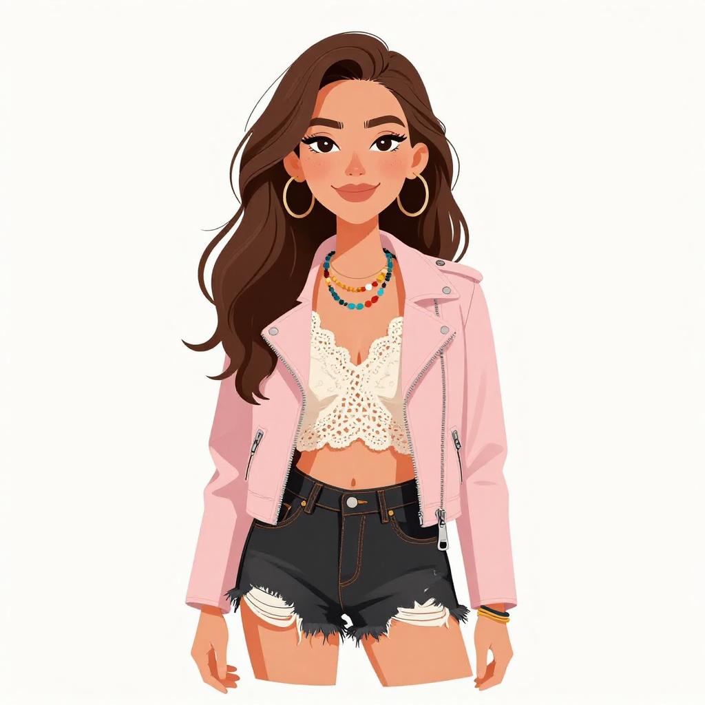 Woman with pretty face and pretty hair. smiling Woman, casual boho, pale pink faux leather jacket, zipper details, lace-trimmed ivory crochet tank top, frayed black denim shorts, layered beaded necklaces, multiple bracelets, white background --sref 1467