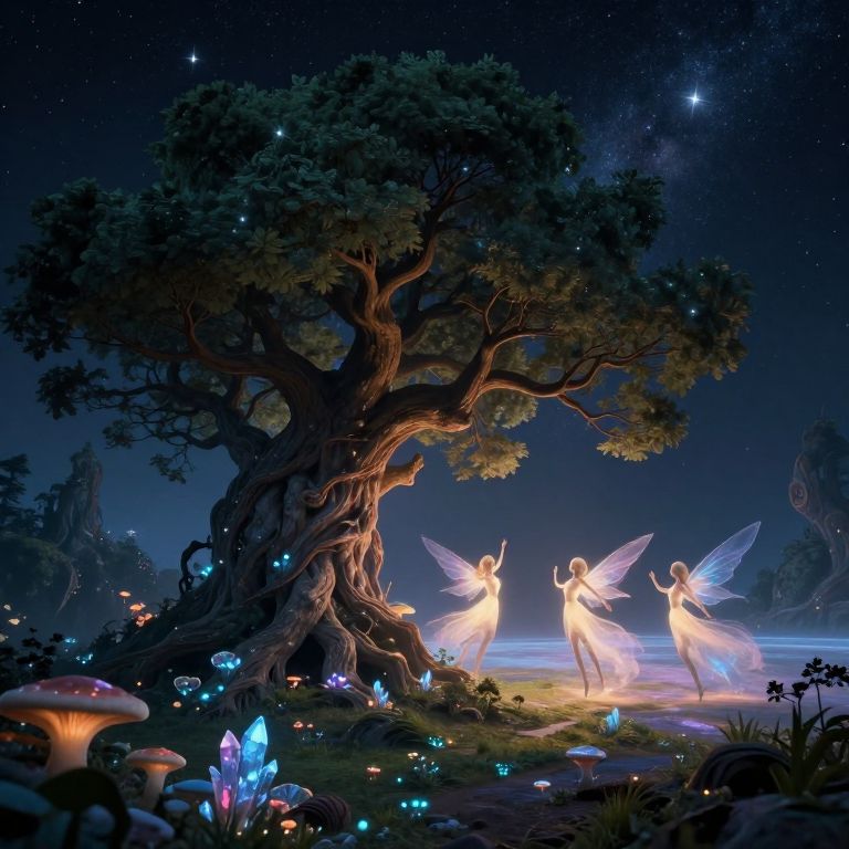 A digital art masterpiece captures an awe-inspiring ancient tree extending towards a star-studded sky, its twisted branches yearning to touch the celestial canvas. The scene transitions from a mystical forest floor adorned with bioluminescent fungi and radiant crystal formations, to the serene surface of an alien world where ethereal beings dance around the tree's base, their gossamer wings reflecting in the warm, ethereal glow. This enigmatic and captivating image stirs emotions of fascination and intrigue, beckoning viewers into a realm where fantasy converges with cosmic adventure.