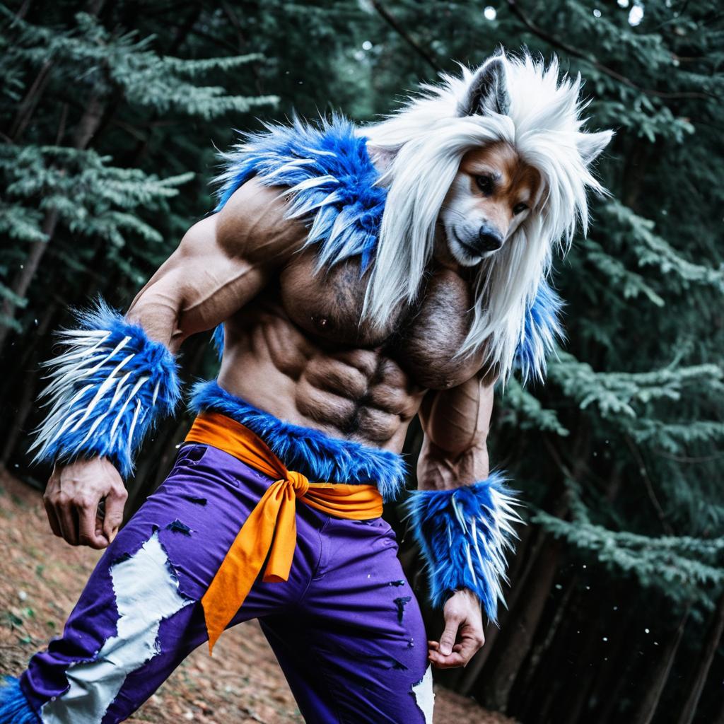 Sexy cosplay Jon Talbain, muscular furry werewolf with wild spiky white hair, blue and white fur pattern, torn purple pants, orange waist sash, Dutch angle