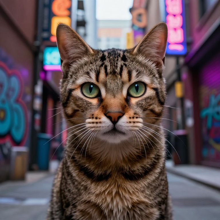 Photograph of a tabby cat with green eyes, centered in the foreground. The cat has dark brown and black striped fur, prominent white whiskers, and a focused expression. The background is a vibrant urban alleyway, slightly blurred, featuring colorful neon signs in pink, blue, and orange, and graffiti on the brick walls. The alley is narrow with concrete pavement, and a metal trash can is visible on the left. The cat's fur texture is detailed, contrasting with the smooth, colorful background. The overall scene combines the sharp focus of the cat with the soft, colorful bokeh of the alleyway.