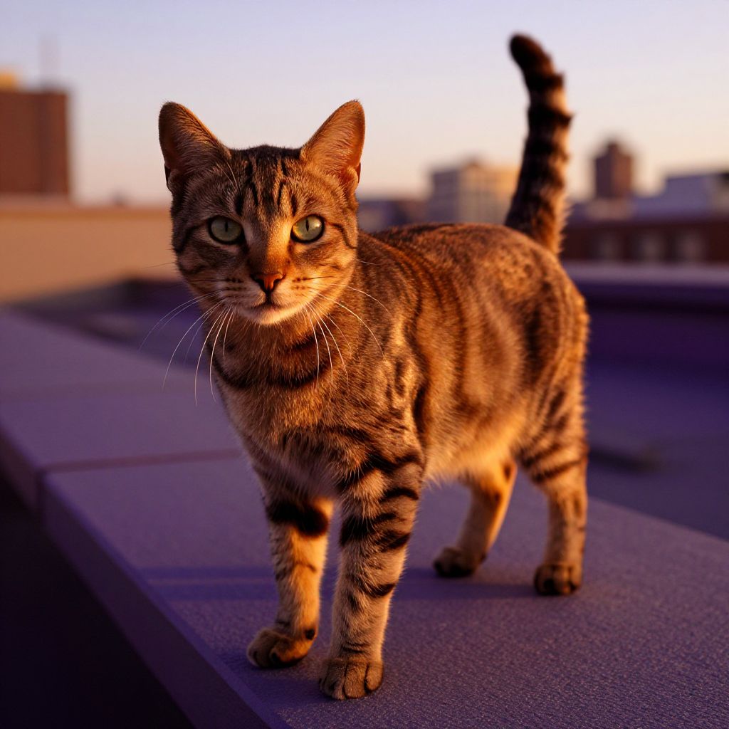 Photograph of a focused, striped tabby cat with green eyes in a vibrant, graffiti-covered urban alley at night, neon signs in the blurred background