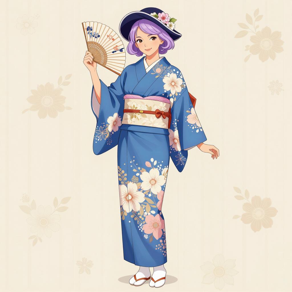 Illustration of an Asian woman wearing a blue floral kimono with wide sleeves and white lace socks. She has short, wavy pastel purple hair and a matching floral hat. The woman is holding a traditional folding fan with her right hand and smiling intensely. The background features beige wallpaper with subtle floral patterns.