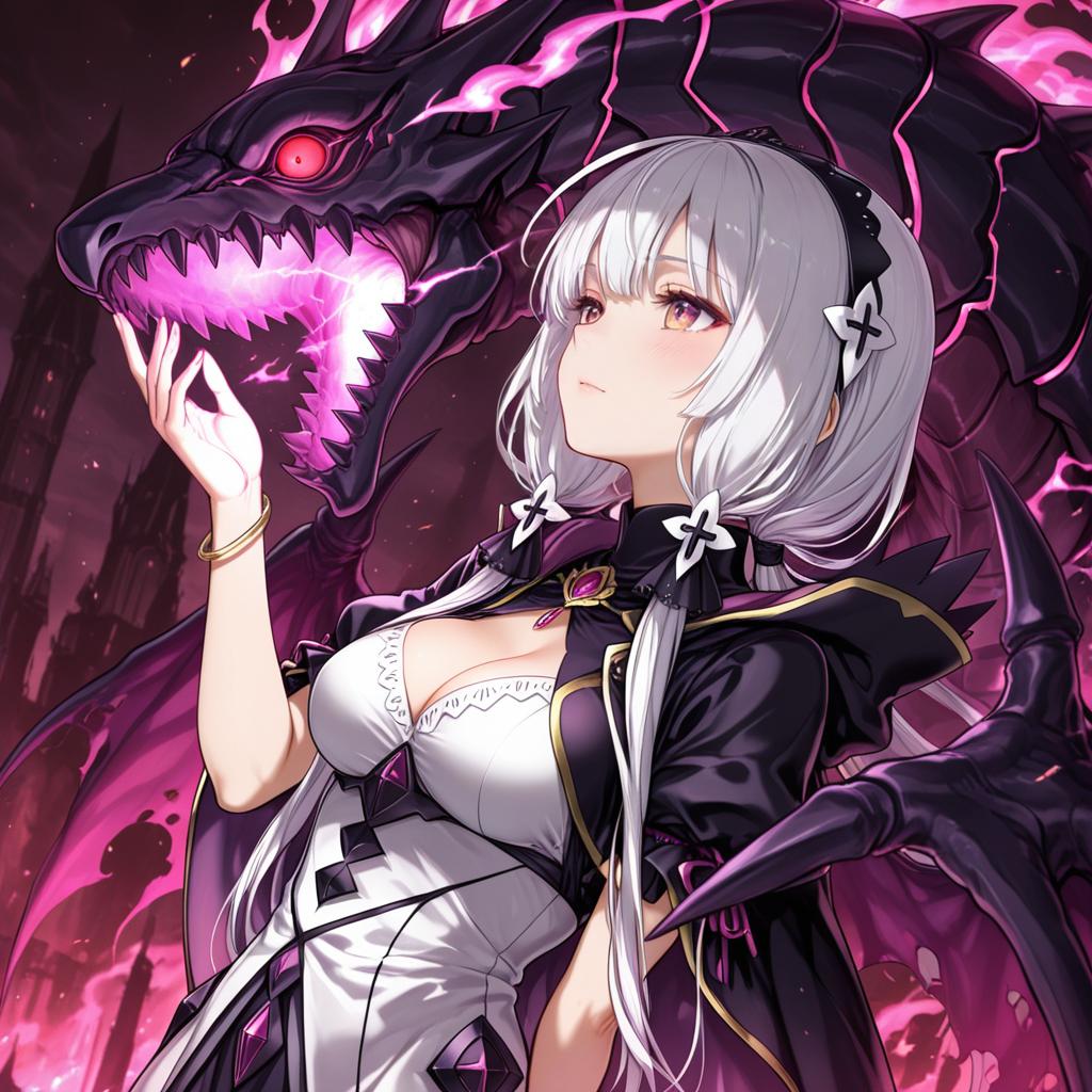 Digital anime-style illustration of a young woman with long white hair styled in twintails, wearing a black and white outfit adorned with purple accents and decorative hair clips shaped like crosses. She has red eyes and is portrayed with a calm expression while standing close to a large, dark dragon emitting purple and pink glowing light. The background is dark with hints of architectural structures and glowing embers, enhancing the fantasy atmosphere.