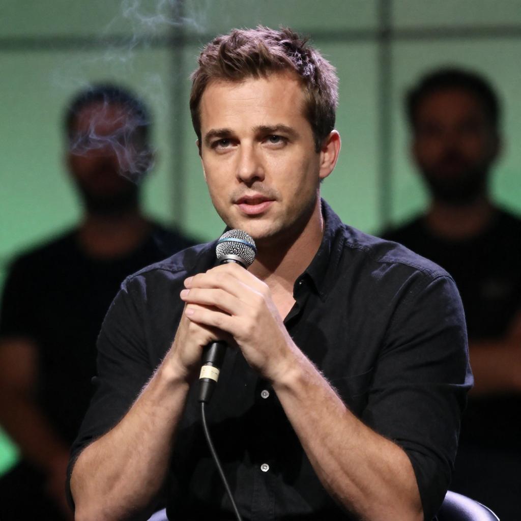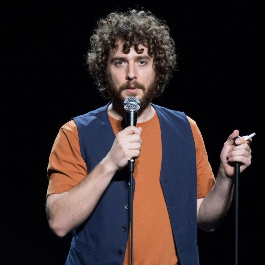 Man with short brown hair and beard, wearing blue and orange hockey jersey with buffalo , holding microphone, speaking, black background with small golden lights. Jersey has number 7 on sleeve, right hand raised.