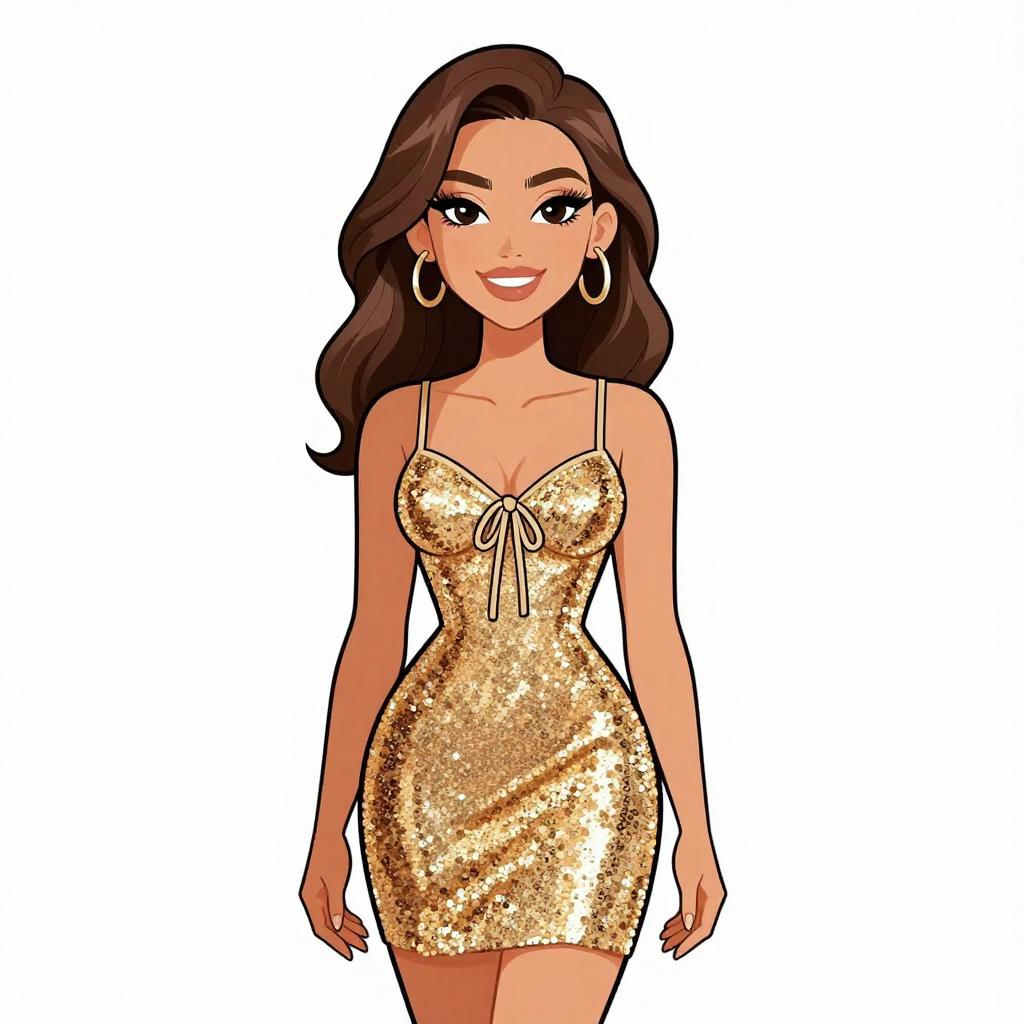 Woman with pretty face and pretty hair. smiling Woman, casual summer, strapless tube mini dress with horizontal rainbow stripes, fitted silhouette, white large hoop earrings, messy bun hairstyle, plain white studio background --sref 1467