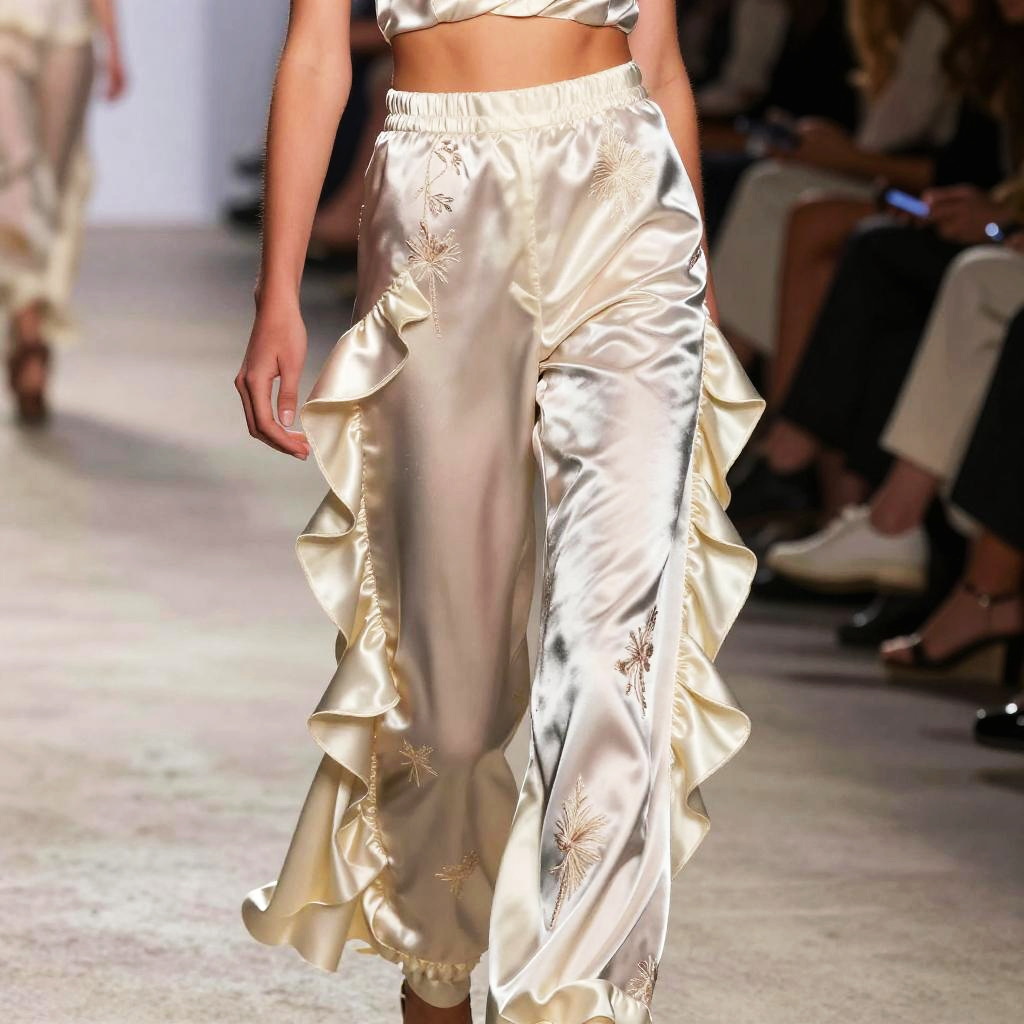 Flirtatious pants made from shiny satin fabric, elegantly draped with ruffles and delicate embroidery, showcased in a fashion runway scene with soft spotlighting and glamour.
