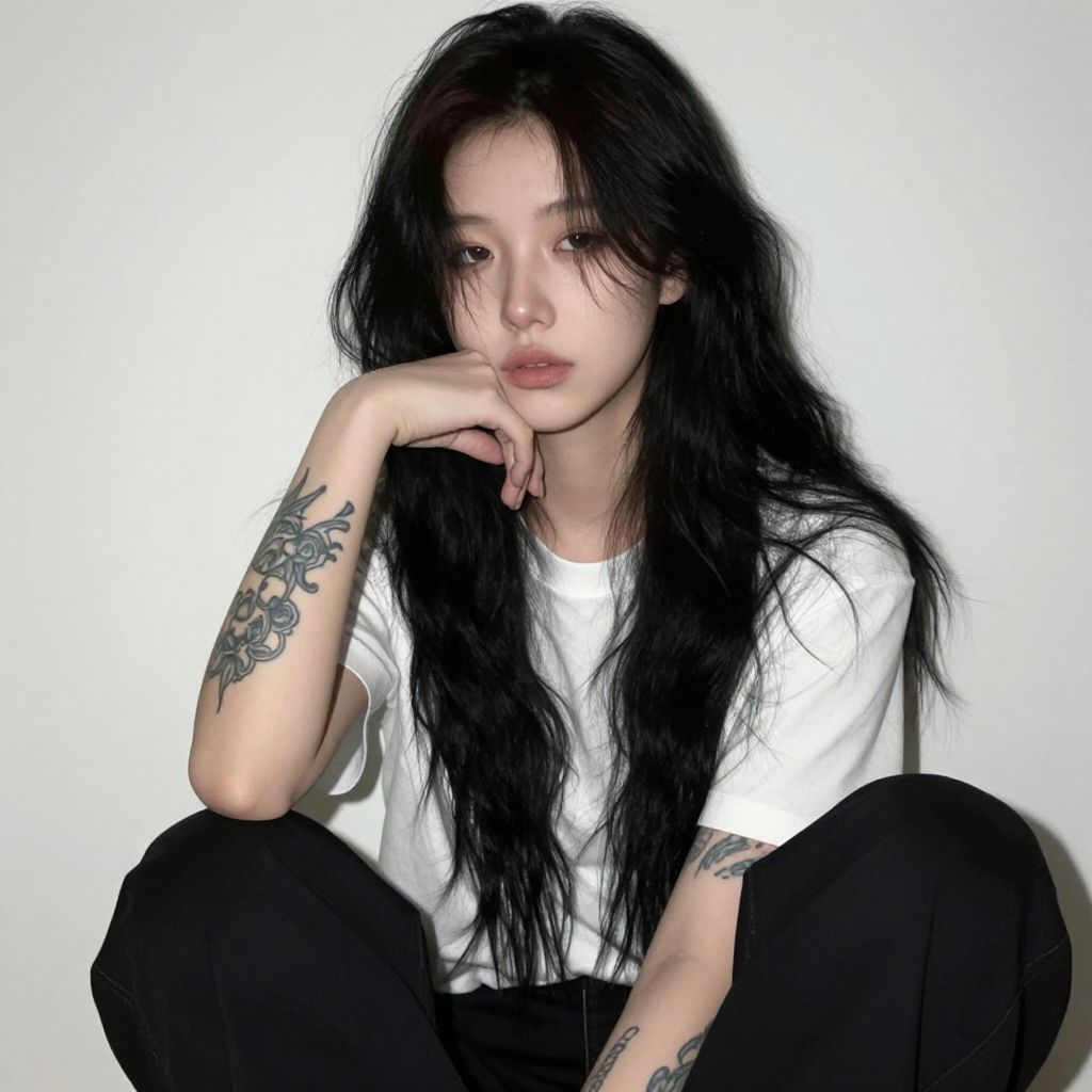 Photograph of an Asian woman with long, dark brown hair, gazing downward. Her right arm, adorned with a large, intricate black and grey tribal tattoo, is prominently displayed. She wears a black, off-shoulder top, and a simple gold ring on her right hand. Her skin is fair, and her expression is contemplative. The background is blurred, featuring dark, muted tones. The lighting is soft, highlighting her tattoo and the delicate texture of her hair. The overall mood is introspective and artistic.