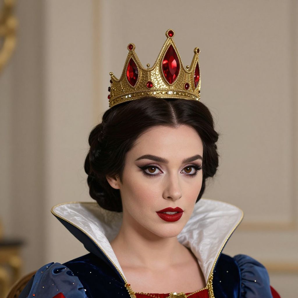 Photograph of a fair-skinned woman with dark, wavy hair styled in a vintage updo, wearing a gold crown adorned with red gemstones. She has striking makeup with bold red lipstick, dark eyeliner, and perfectly shaped eyebrows. Her dress features a high, white, ruffled collar and dark blue, puffed sleeves with gold embroidery. The background is a softly lit, elegant room with cream-colored walls and subtle gold detailing, creating a regal atmosphere. The woman's expression is calm and poised, embodying a classic, fairy-tale princess aesthetic.