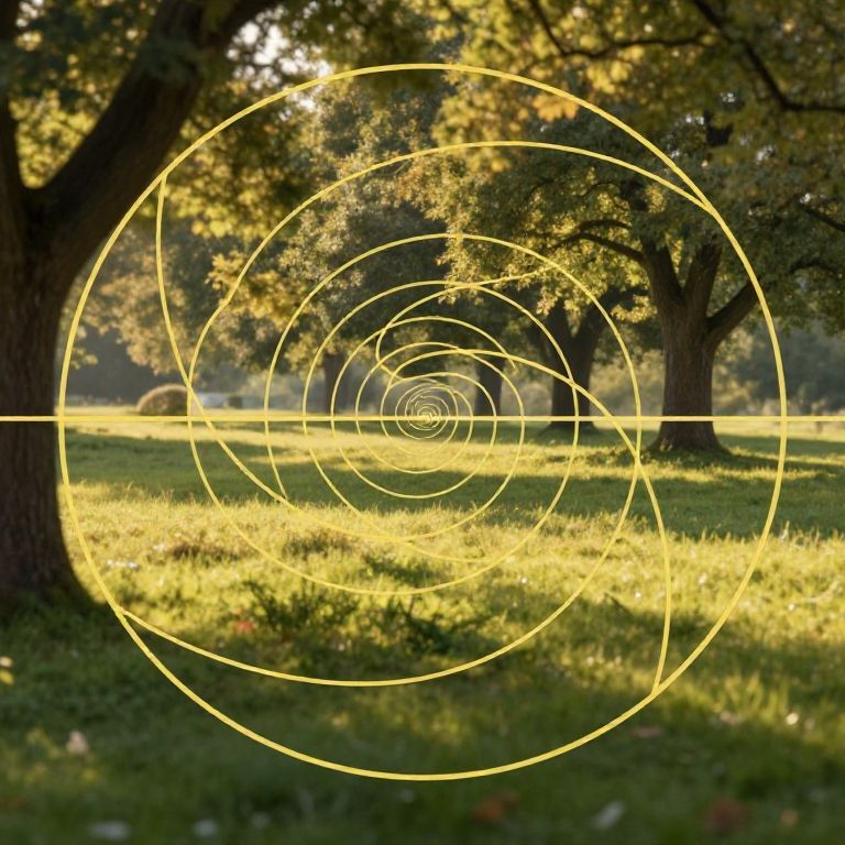 Add Fibonacci spiral overlay to a serene landscape photo, highlighting natural curves with golden ratio design, soft sunlight filtering through trees, warm tones, enhanced depth and harmony, detailed textures and vibrant colors, artistic and balanced composition