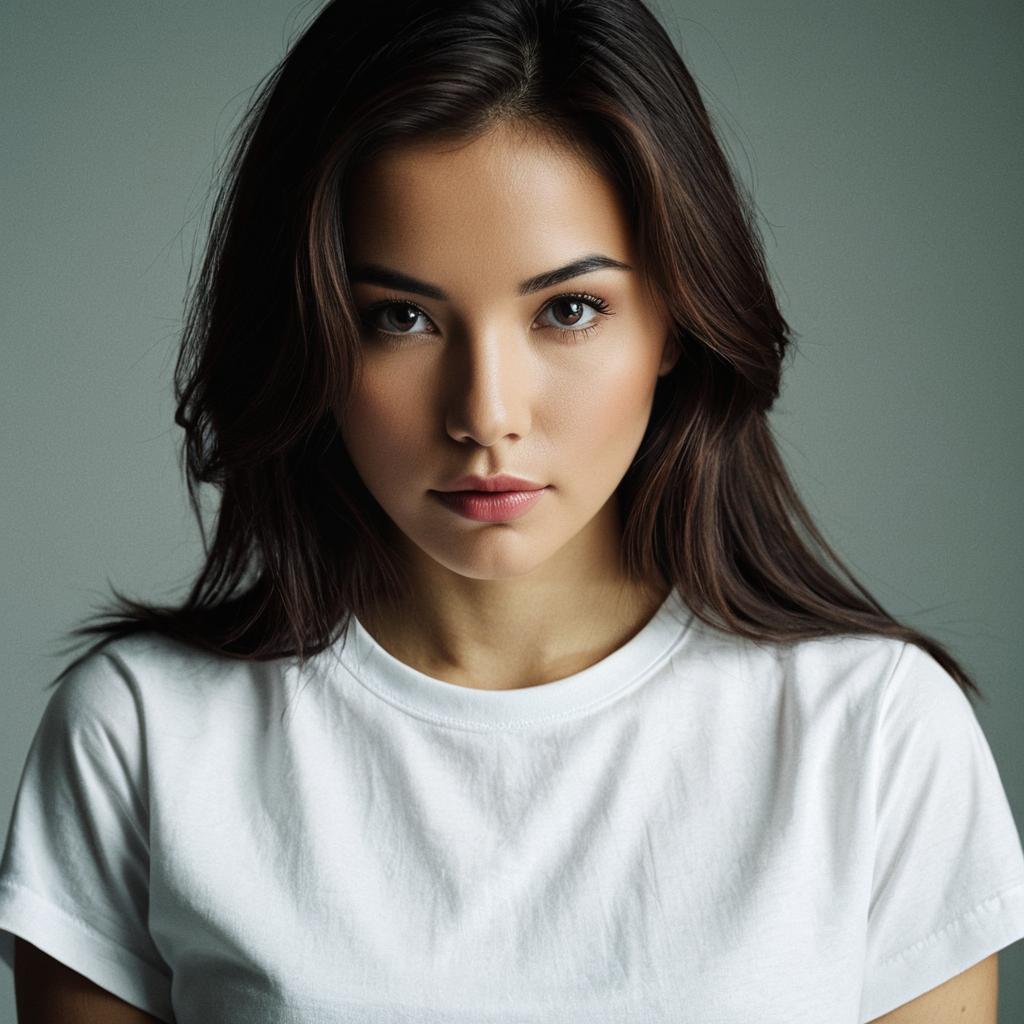 Portrait of a young woman with long brown hair and brown eyes, wearing a sleeveless white dress. She is seated against a grey background, looking directly at the viewer with a calm and confident expression. Her hands are gently placed together in front of her.