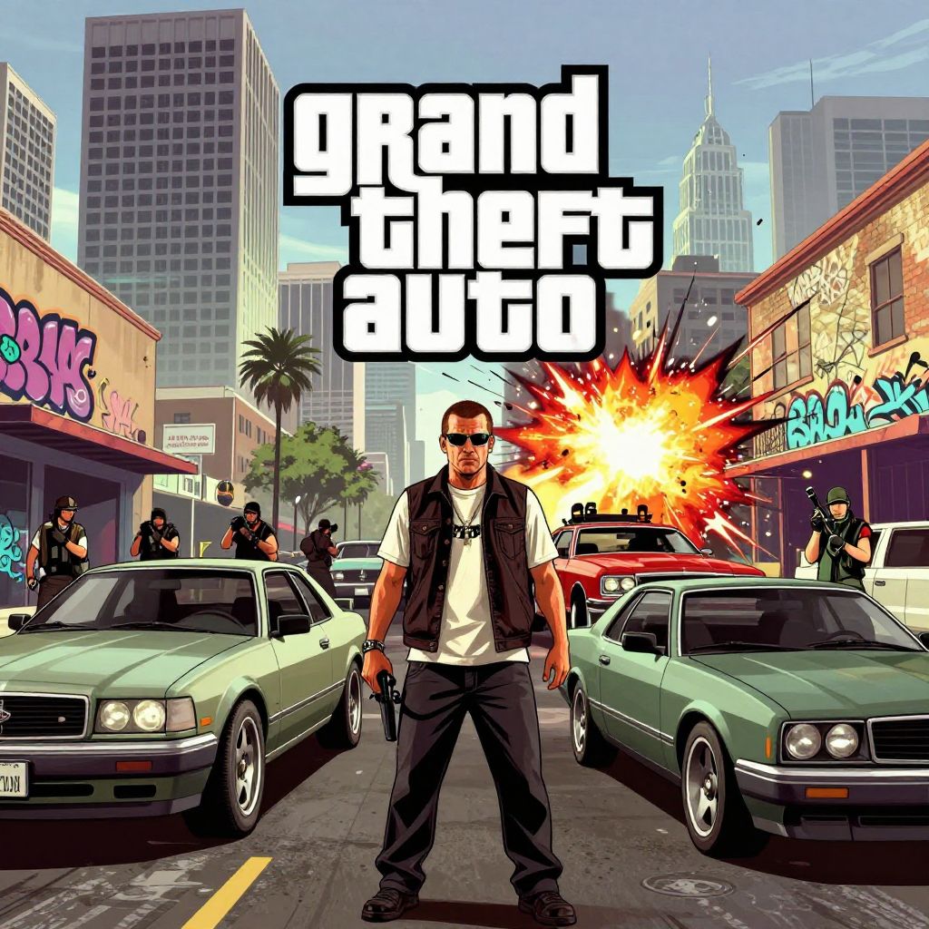 Grand theft auto cover art illustrating a tense street scene filled with detailed vehicles, armed figures, and explosive action, set against a backdrop of skyscrapers and graffiti walls, rendered in a slick, graphic novel inspired style.