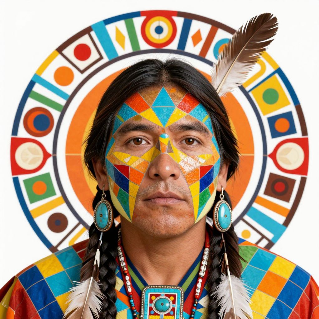Photograph of a Native American man with long black hair, adorned with a white feather. His face is painted in a vibrant, geometric pattern with diamonds in blue, yellow, red, and orange. He wears blue teardrop-shaped earrings and a multicolored traditional shirt. A large, circular, colorful background featuring bold shapes and patterns surrounds his head. His serious expression contrasts with the bright, intricate designs. The image has a high-contrast, vivid style, emphasizing traditional cultural elements.