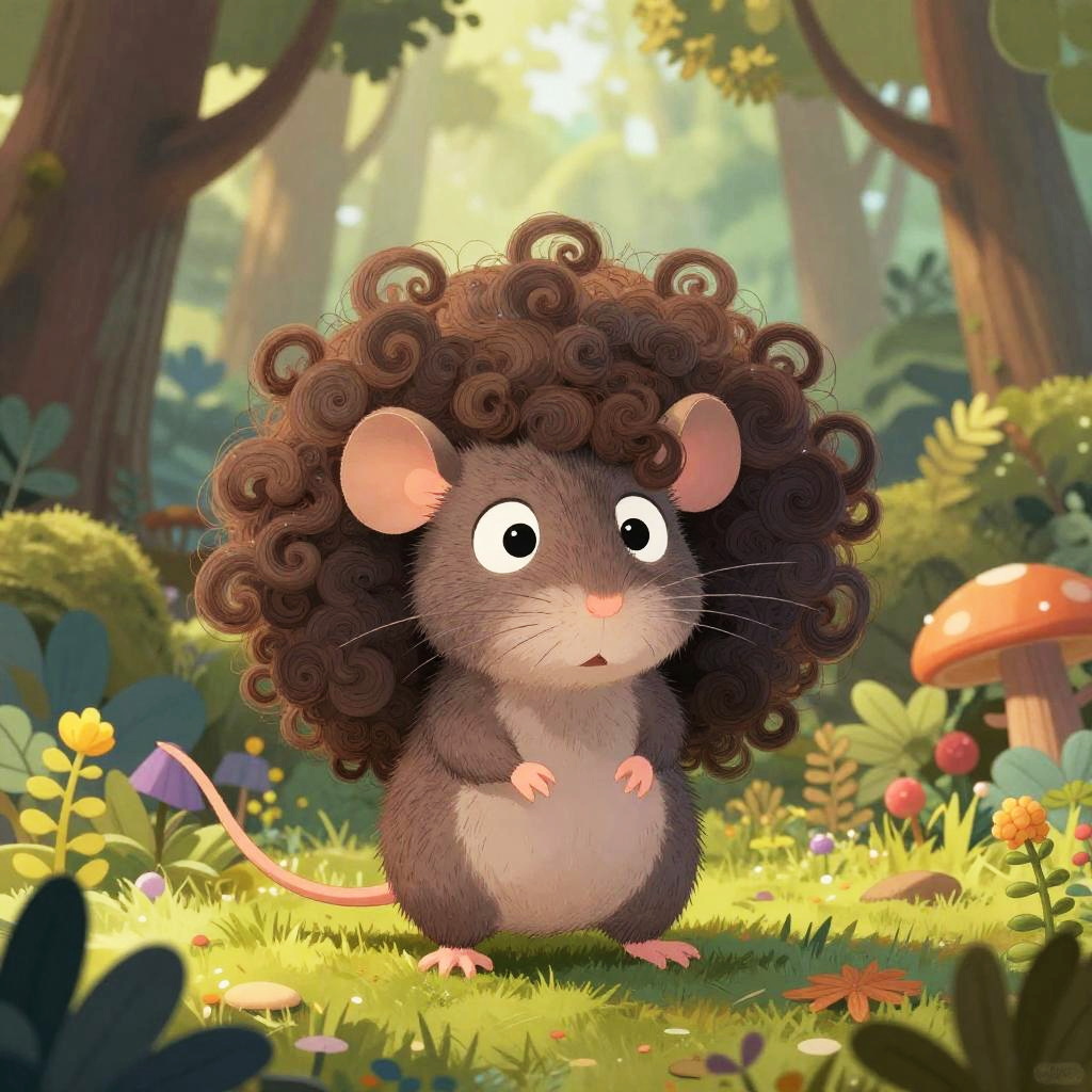 A cartoon-style rat riding a vintage motorcycle through a whimsical forest, sunlight filtering through the trees, bright and cheerful atmosphere, detailed leaves and plants, playful expression on the rat's face, colorful and lively scene.