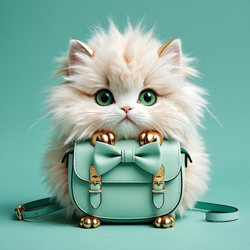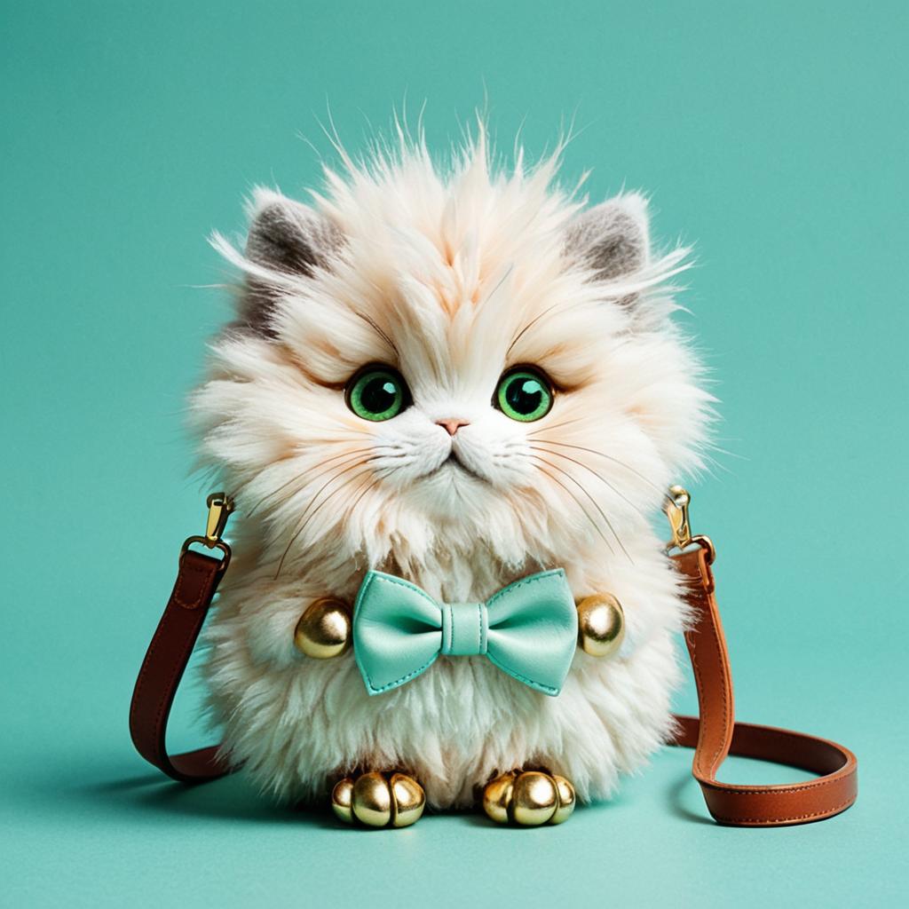 Digital artwork of a cute, rounded fluffy creature with big green eyes, the fur on top of the head is soft coral with silver whiskers, fur in front of the body is light mint, and the rest of the body is warm beige, with tiny gold fingers and toes, wearing azure bowtie and leather satchel, set against a calm teal background with gentle waves.