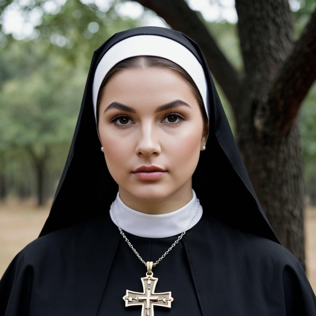 Portrait of a young woman dressed in a traditional black and white nun habit, wearing a large gold cross necklace. She has brown hair neatly covered by the habit, brown eyes, and a calm, composed expression. The background is an outdoor setting with blurred green trees.