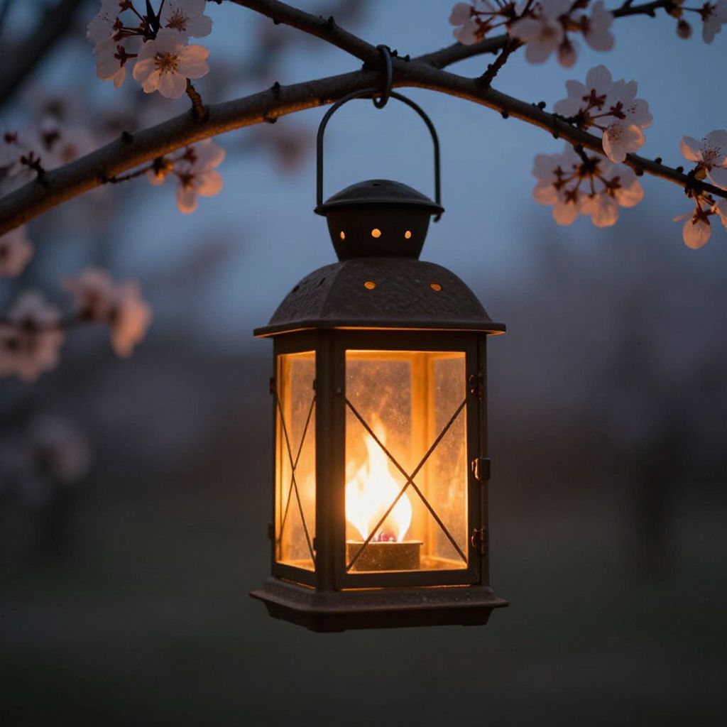 Kasih illustrated as a glowing flame inside a rustic lantern hanging from a blossoming tree branch at twilight, warm light contrasting with cool evening tones, symbolizing hope, nurturing love, and the enduring strength of human kindness.