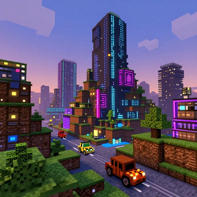 Futuristic Minecraft wallpaper showcasing a pixel art cityscape at dusk, with towering block structures, neon lights, and pixelated vehicles, blending classic Minecraft cubic style with techno vibes, enhanced by glowing light effects and sharp contrasts.
