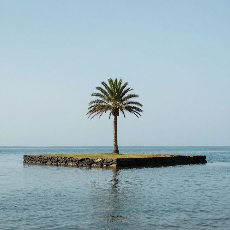 Suspended between sky and sea, a solitary palm tree stands atop a perfectly flat, rectangular island that defies gravity, its edges sharply defined against the tranquil waters below.